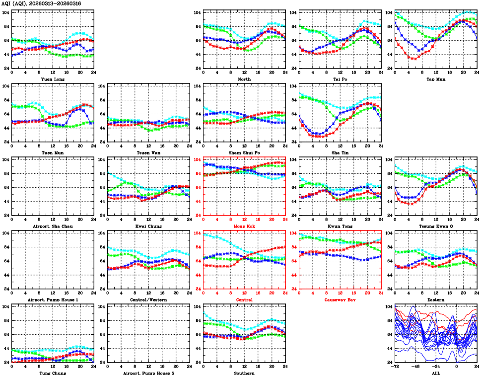 | Air Quality Data Time Series for AQI (2026/03/16) | ( Line colors: Day -3 Day -2 Day -1 Current day ) | 2D Map Current AQHI |