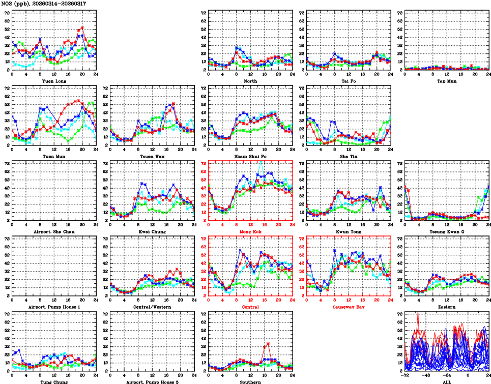 | Air Quality Data Time Series for NO2 (2026/03/17) | ( Line colors: Day -3 Day -2 Day -1 Current day ) | 2D Map Current AQHI |