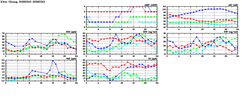 | Air Quality Data Time Series in Kwai Chung (2026/03/13) | ( Line colors: Day -3 Day -2 Day -1 Current day ) | 2D Map Current AQHI |