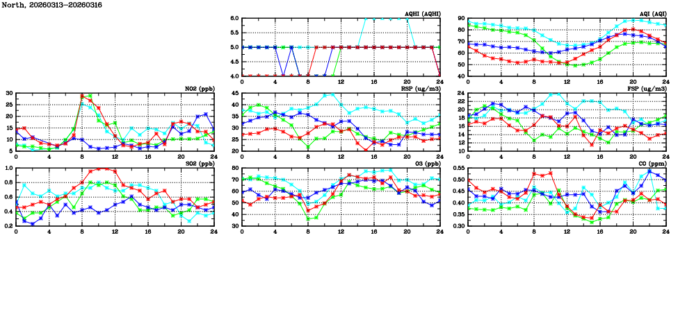 | Air Quality Data Time Series in North (2026/03/16) | ( Line colors: Day -3 Day -2 Day -1 Current day ) | 2D Map Current AQHI |
