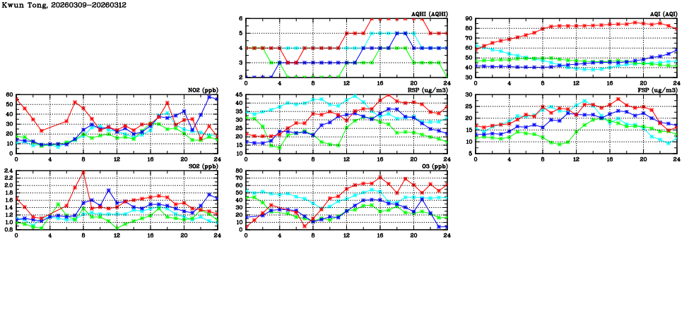 | Air Quality Data Time Series in Kwun Tong (2026/03/12) | ( Line colors: Day -3 Day -2 Day -1 Current day ) | 2D Map Current AQHI |