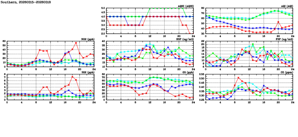 | Air Quality Data Time Series in Southern (2026/03/18) | ( Line colors: Day -3 Day -2 Day -1 Current day ) | 2D Map Current AQHI |