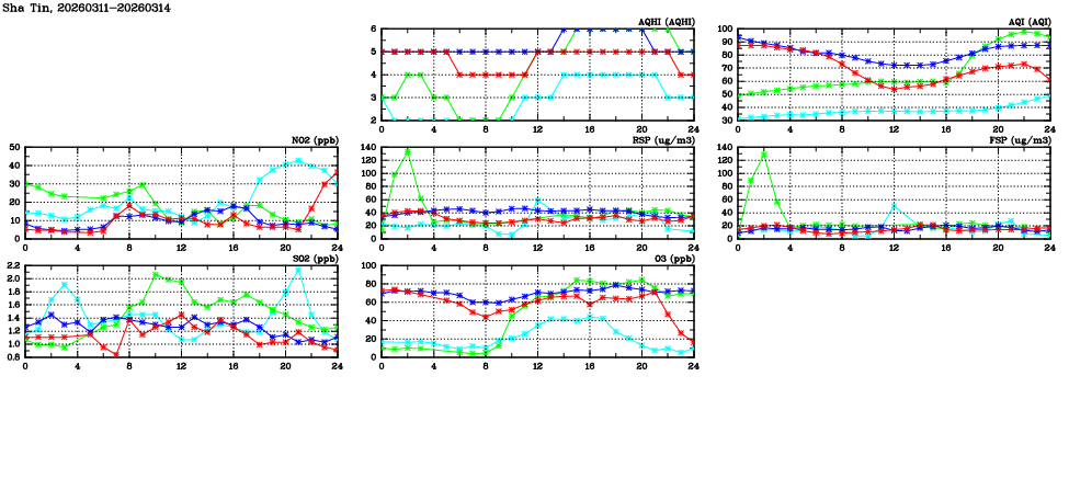 | Air Quality Data Time Series in Sha Tin (2026/03/14) | ( Line colors: Day -3 Day -2 Day -1 Current day ) | 2D Map Current AQHI |