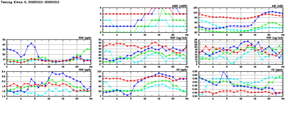 | Air Quality Data Time Series in Tseung Kwan O (2026/03/13) | ( Line colors: Day -3 Day -2 Day -1 Current day ) | 2D Map Current AQHI |