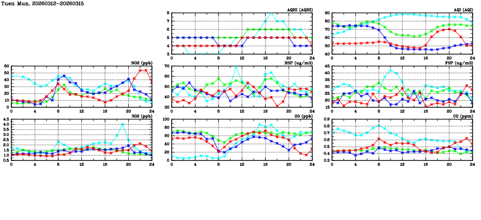 | Air Quality Data Time Series in Tuen Mun (2026/03/15) | ( Line colors: Day -3 Day -2 Day -1 Current day ) | 2D Map Current AQHI |