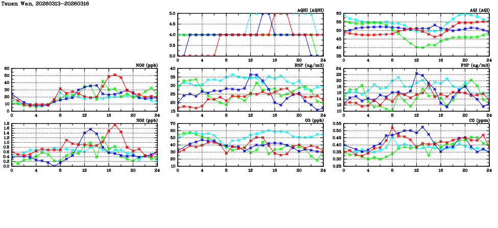 | Air Quality Data Time Series in Tsuen Wan (2026/03/16) | ( Line colors: Day -3 Day -2 Day -1 Current day ) | 2D Map Current AQHI |