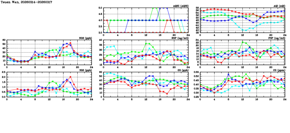 | Air Quality Data Time Series in Tsuen Wan (2026/03/17) | ( Line colors: Day -3 Day -2 Day -1 Current day ) | 2D Map Current AQHI |