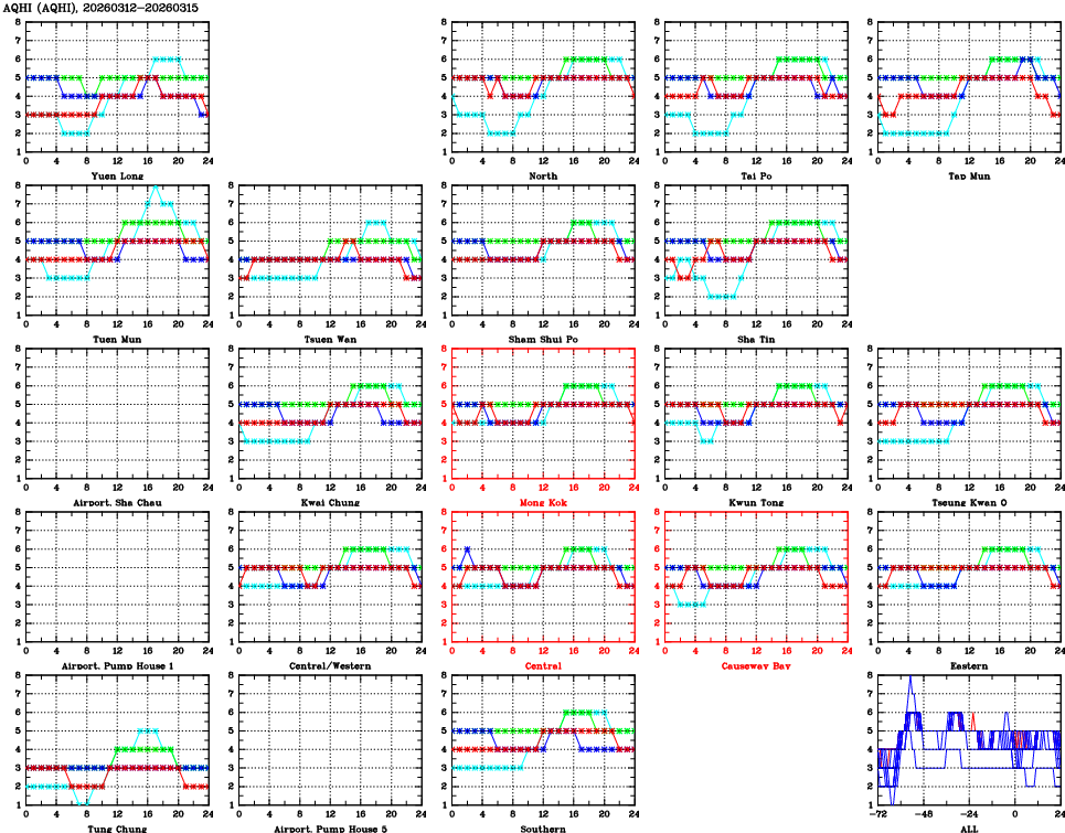 | Air Quality Data Time Series for AQHI (2026/03/15) | ( Line colors: Day -3 Day -2 Day -1 Current day ) | 2D Map Current AQHI |