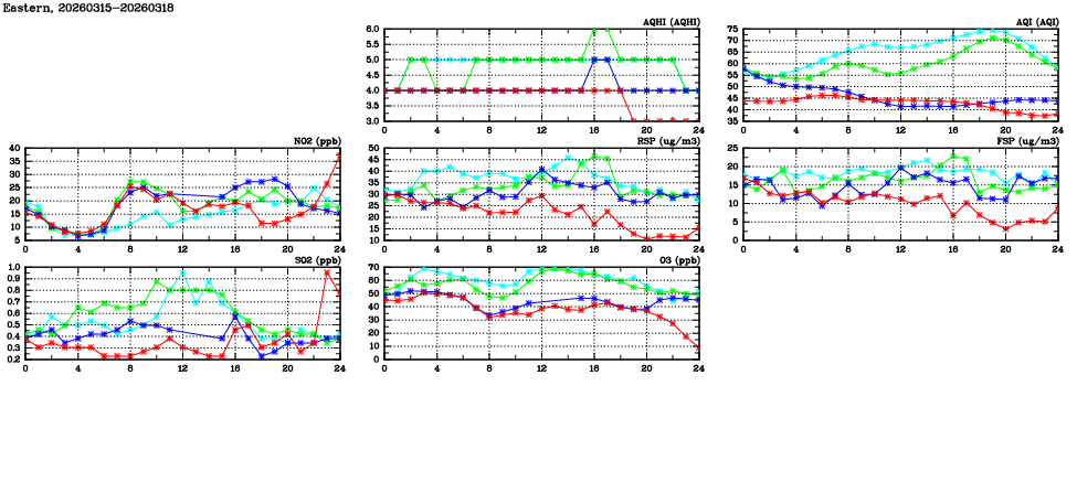 | Air Quality Data Time Series in Eastern (2026/03/18) | ( Line colors: Day -3 Day -2 Day -1 Current day ) | 2D Map Current AQHI |