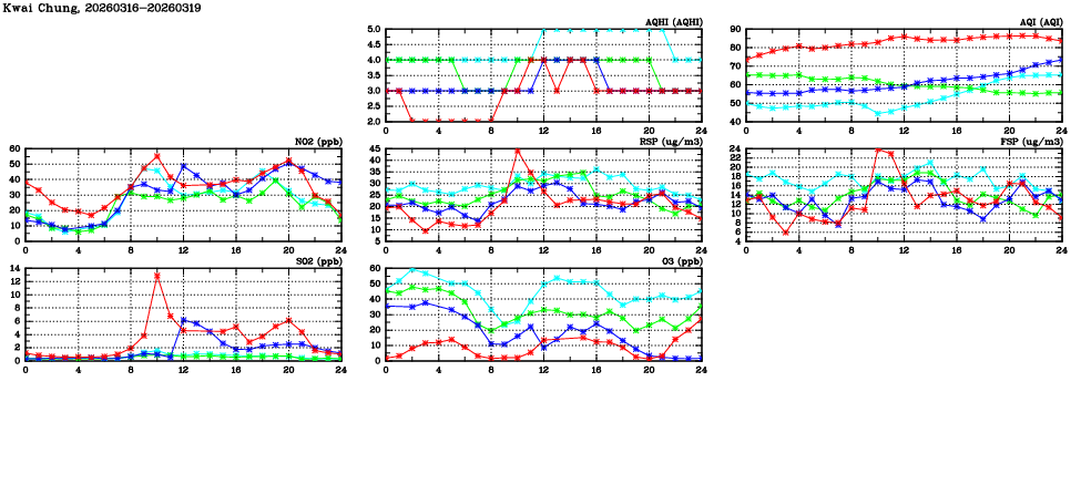 | Air Quality Data Time Series in Kwai Chung (2026/03/19) | ( Line colors: Day -3 Day -2 Day -1 Current day ) | 2D Map Current AQHI |