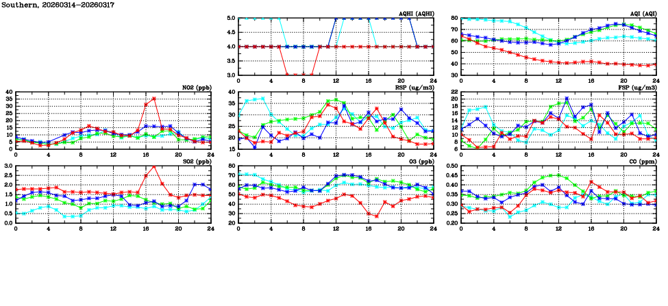| Air Quality Data Time Series in Southern (2026/03/17) | ( Line colors: Day -3 Day -2 Day -1 Current day ) | 2D Map Current AQHI |