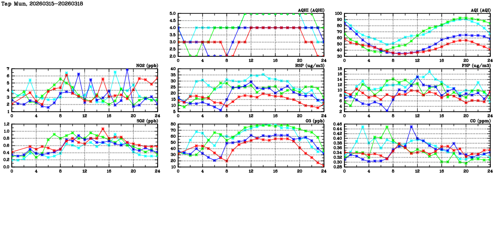 | Air Quality Data Time Series in Tap Mun (2026/03/18) | ( Line colors: Day -3 Day -2 Day -1 Current day ) | 2D Map Current AQHI |