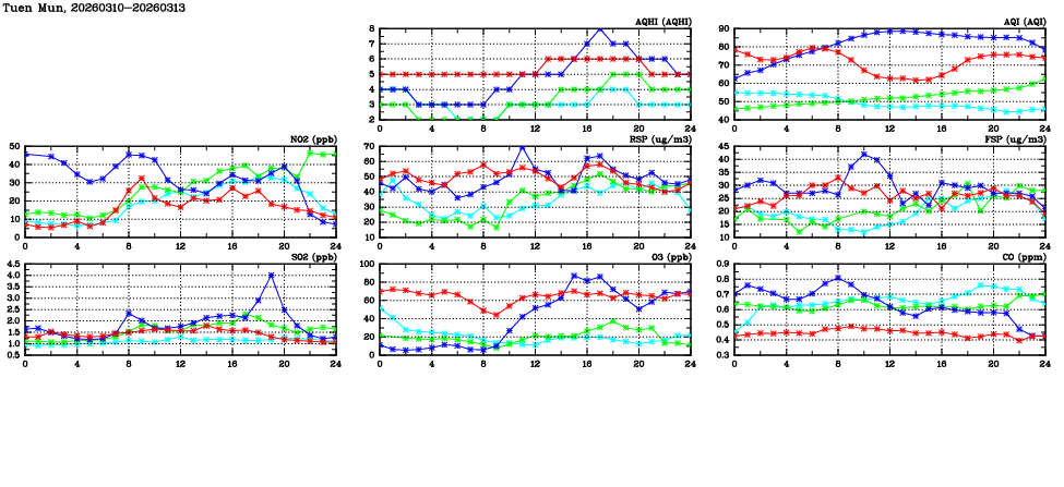 | Air Quality Data Time Series in Tuen Mun (2026/03/13) | ( Line colors: Day -3 Day -2 Day -1 Current day ) | 2D Map Current AQHI |
