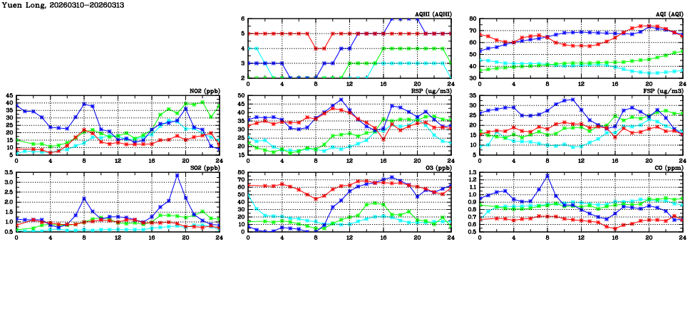 | Air Quality Data Time Series in Yuen Long (2026/03/13) | ( Line colors: Day -3 Day -2 Day -1 Current day ) | 2D Map Current AQHI |