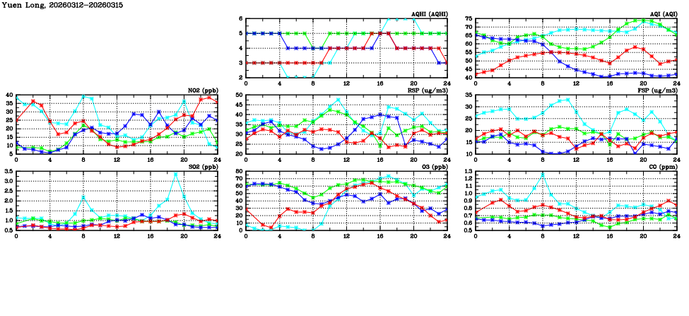| Air Quality Data Time Series in Yuen Long (2026/03/15) | ( Line colors: Day -3 Day -2 Day -1 Current day ) | 2D Map Current AQHI |