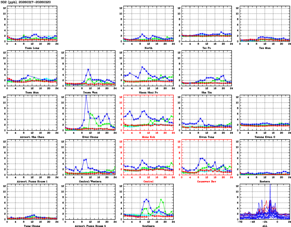 | Air Quality Data Time Series for SO2 (2026/03/20) | ( Line colors: Day -3 Day -2 Day -1 Current day ) | 2D Map Current AQHI |