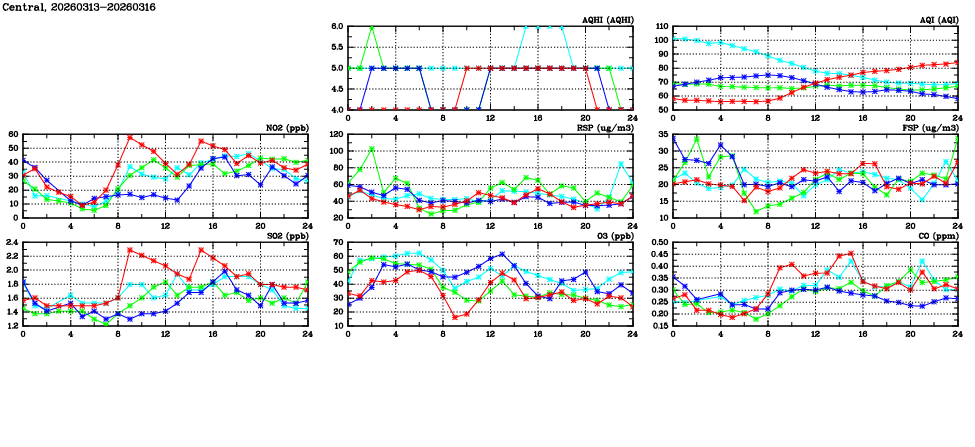 | Air Quality Data Time Series in Central (2026/03/16) | ( Line colors: Day -3 Day -2 Day -1 Current day ) | 2D Map Current AQHI |