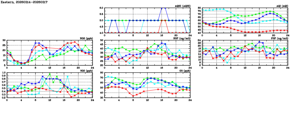 | Air Quality Data Time Series in Eastern (2026/03/17) | ( Line colors: Day -3 Day -2 Day -1 Current day ) | 2D Map Current AQHI |