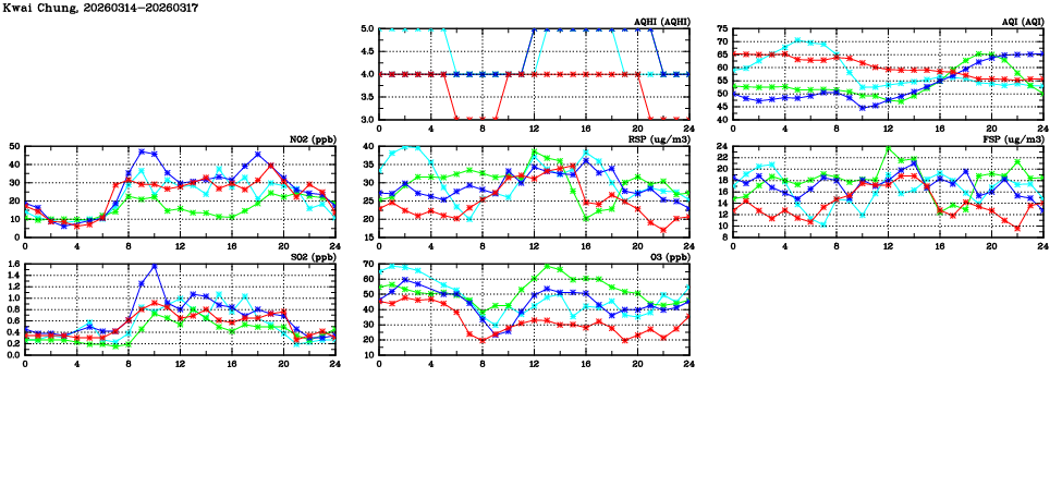 | Air Quality Data Time Series in Kwai Chung (2026/03/17) | ( Line colors: Day -3 Day -2 Day -1 Current day ) | 2D Map Current AQHI |