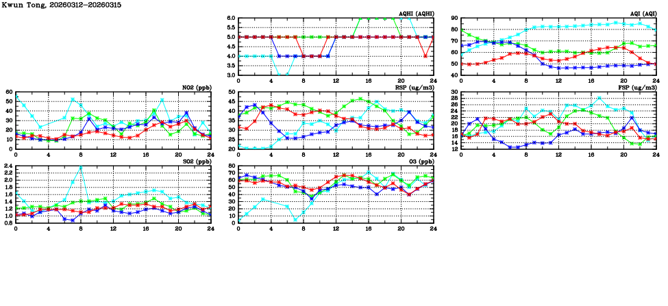 | Air Quality Data Time Series in Kwun Tong (2026/03/15) | ( Line colors: Day -3 Day -2 Day -1 Current day ) | 2D Map Current AQHI |