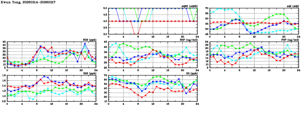 | Air Quality Data Time Series in Kwun Tong (2026/03/17) | ( Line colors: Day -3 Day -2 Day -1 Current day ) | 2D Map Current AQHI |