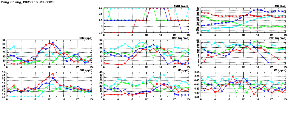 | Air Quality Data Time Series in Tung Chung (2026/03/19) | ( Line colors: Day -3 Day -2 Day -1 Current day ) | 2D Map Current AQHI |