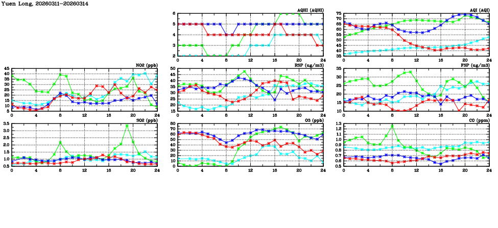 | Air Quality Data Time Series in Yuen Long (2026/03/14) | ( Line colors: Day -3 Day -2 Day -1 Current day ) | 2D Map Current AQHI |
