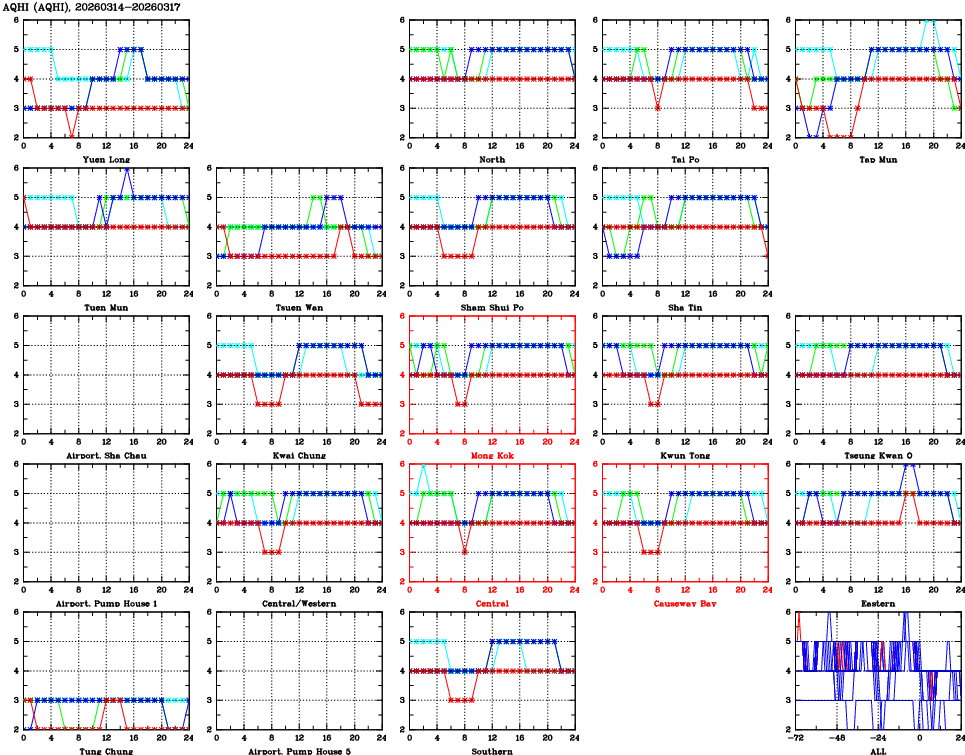 | Air Quality Data Time Series for AQHI (2026/03/17) | ( Line colors: Day -3 Day -2 Day -1 Current day ) | 2D Map Current AQHI |