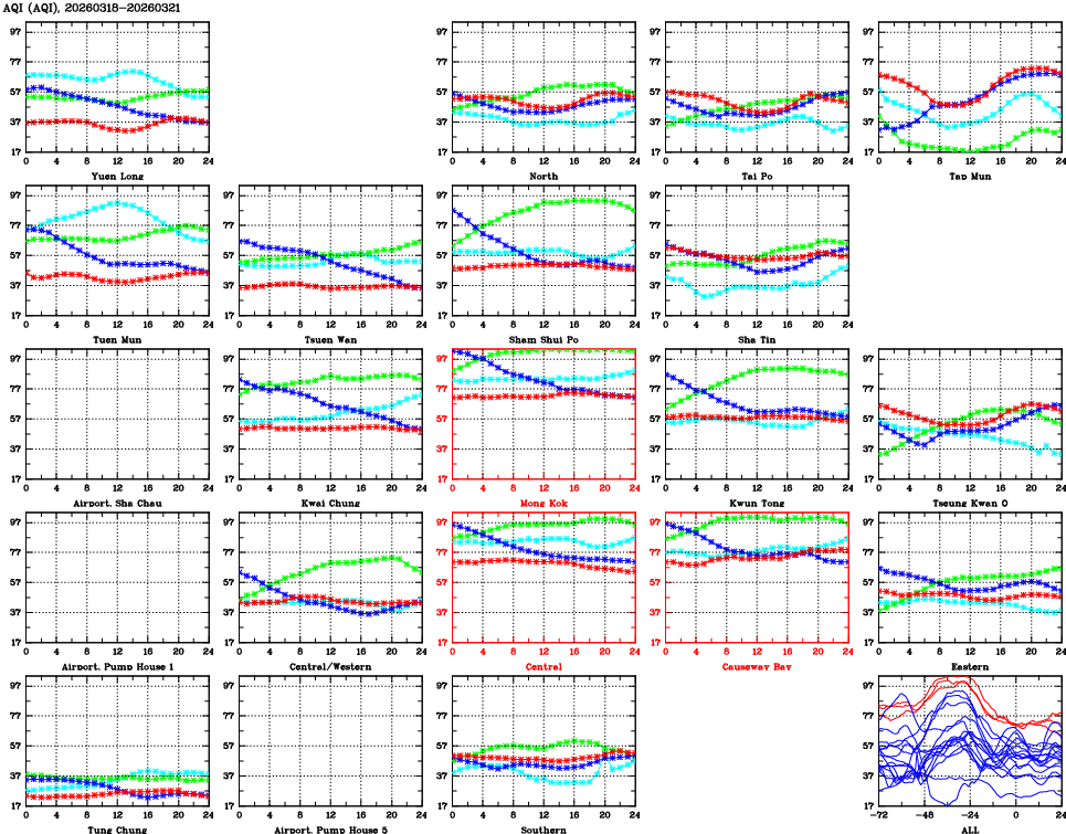 | Air Quality Data Time Series for AQI (2026/03/21) | ( Line colors: Day -3 Day -2 Day -1 Current day ) | 2D Map Current AQHI |
