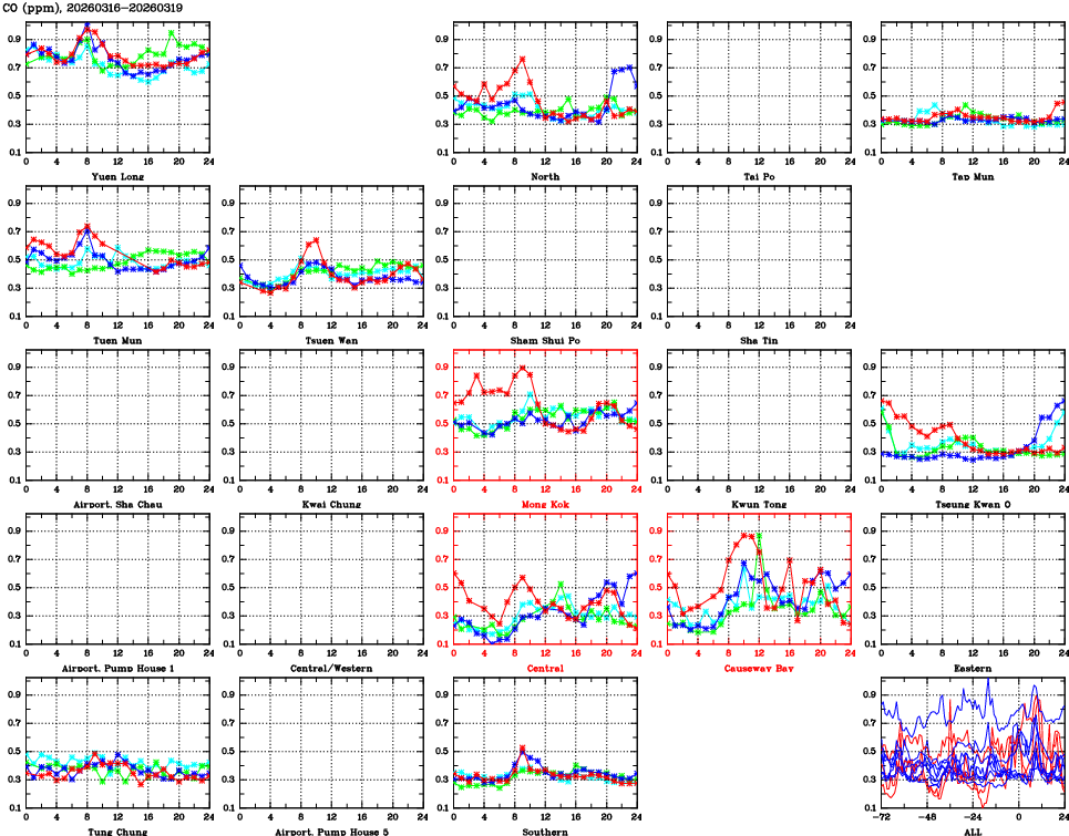 | Air Quality Data Time Series for CO (2026/03/19) | ( Line colors: Day -3 Day -2 Day -1 Current day ) | 2D Map Current AQHI |