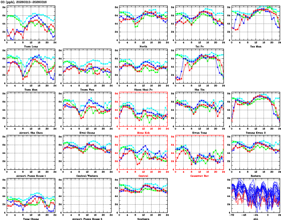 | Air Quality Data Time Series for O3 (2026/03/16) | ( Line colors: Day -3 Day -2 Day -1 Current day ) | 2D Map Current AQHI |