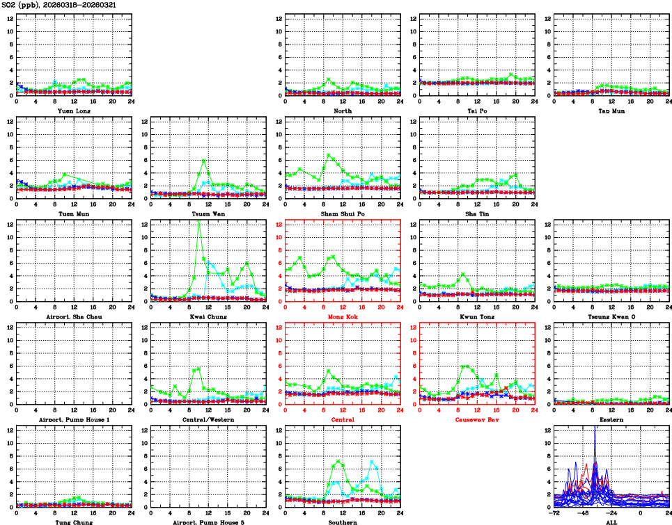 | Air Quality Data Time Series for SO2 (2026/03/21) | ( Line colors: Day -3 Day -2 Day -1 Current day ) | 2D Map Current AQHI |