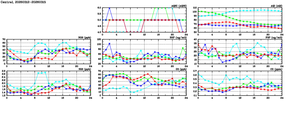 | Air Quality Data Time Series in Central (2026/03/15) | ( Line colors: Day -3 Day -2 Day -1 Current day ) | 2D Map Current AQHI |
