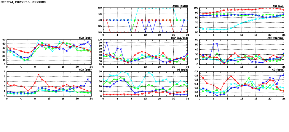 | Air Quality Data Time Series in Central (2026/03/19) | ( Line colors: Day -3 Day -2 Day -1 Current day ) | 2D Map Current AQHI |
