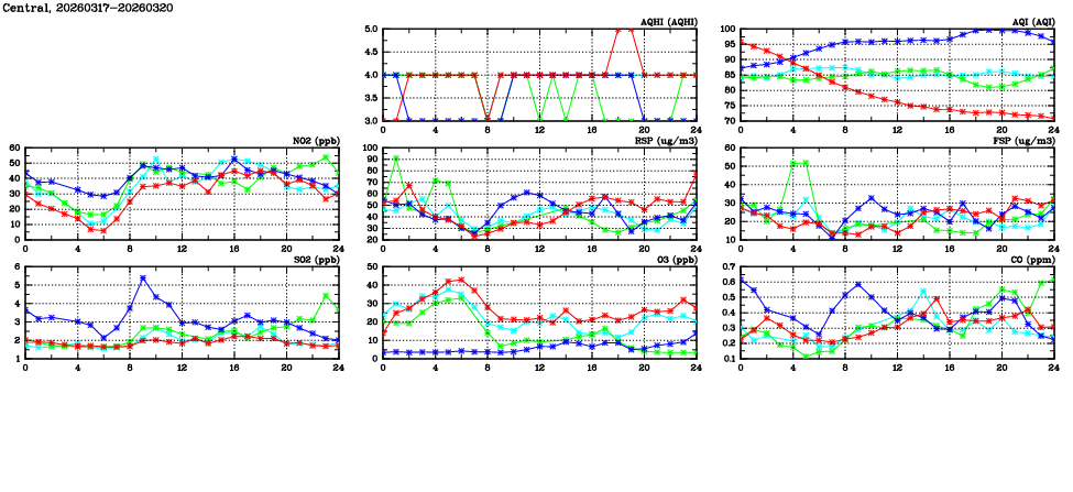 | Air Quality Data Time Series in Central (2026/03/20) | ( Line colors: Day -3 Day -2 Day -1 Current day ) | 2D Map Current AQHI |
