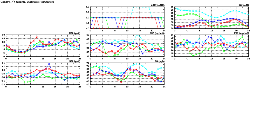 | Air Quality Data Time Series in Central/Western (2026/03/16) | ( Line colors: Day -3 Day -2 Day -1 Current day ) | 2D Map Current AQHI |