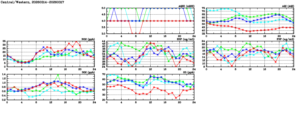 | Air Quality Data Time Series in Central/Western (2026/03/17) | ( Line colors: Day -3 Day -2 Day -1 Current day ) | 2D Map Current AQHI |