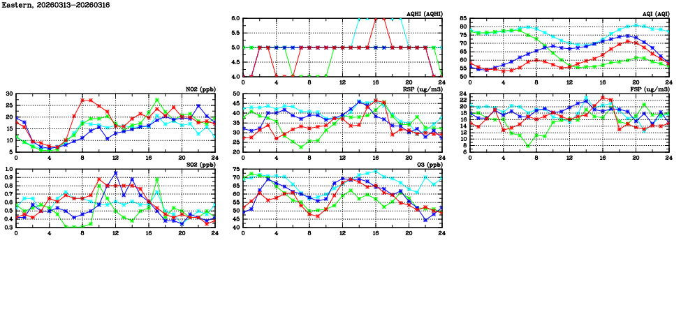 | Air Quality Data Time Series in Eastern (2026/03/16) | ( Line colors: Day -3 Day -2 Day -1 Current day ) | 2D Map Current AQHI |