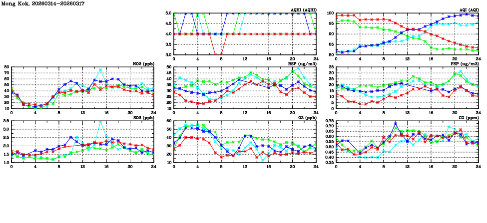 | Air Quality Data Time Series in Mong Kok (2026/03/17) | ( Line colors: Day -3 Day -2 Day -1 Current day ) | 2D Map Current AQHI |