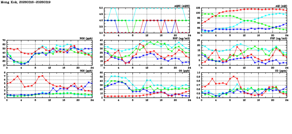 | Air Quality Data Time Series in Mong Kok (2026/03/19) | ( Line colors: Day -3 Day -2 Day -1 Current day ) | 2D Map Current AQHI |