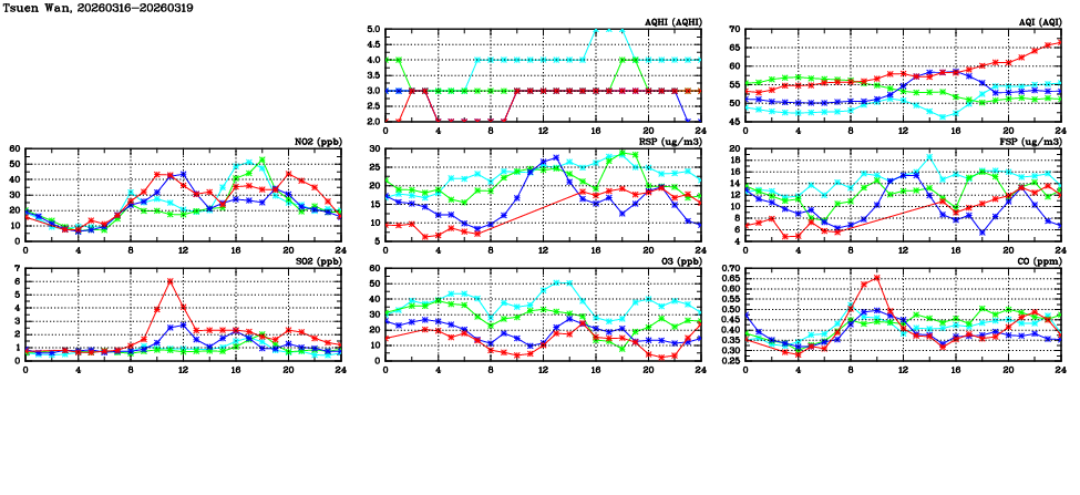 | Air Quality Data Time Series in Tsuen Wan (2026/03/19) | ( Line colors: Day -3 Day -2 Day -1 Current day ) | 2D Map Current AQHI |