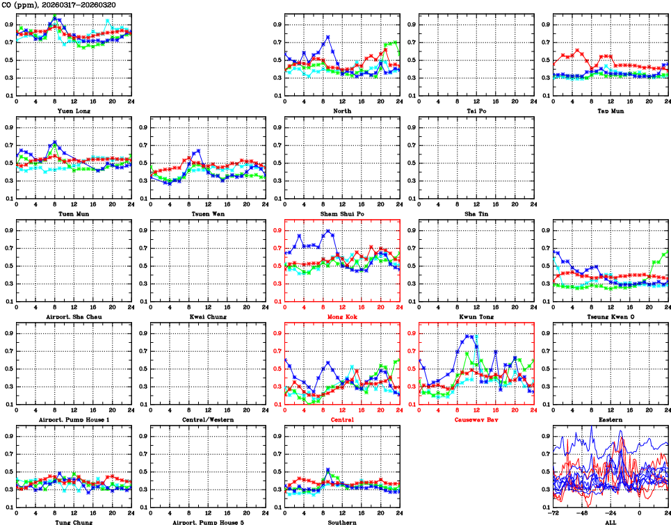 | Air Quality Data Time Series for CO (2026/03/20) | ( Line colors: Day -3 Day -2 Day -1 Current day ) | 2D Map Current AQHI |