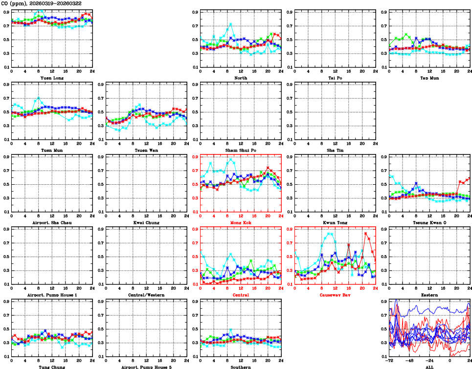 | Air Quality Data Time Series for CO (2026/03/22) | ( Line colors: Day -3 Day -2 Day -1 Current day ) | 2D Map Current AQHI |