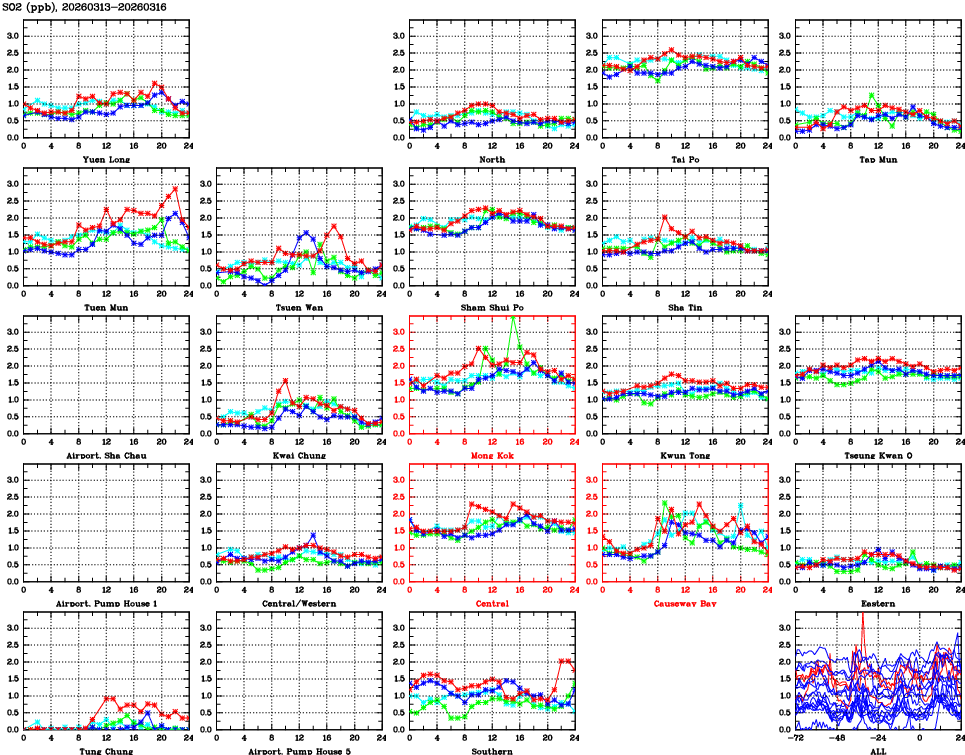 | Air Quality Data Time Series for SO2 (2026/03/16) | ( Line colors: Day -3 Day -2 Day -1 Current day ) | 2D Map Current AQHI |