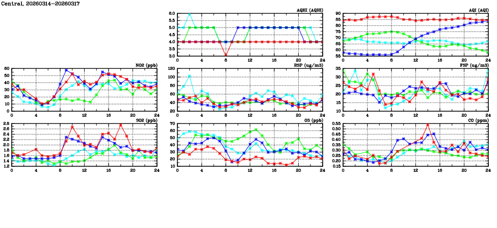 | Air Quality Data Time Series in Central (2026/03/17) | ( Line colors: Day -3 Day -2 Day -1 Current day ) | 2D Map Current AQHI |