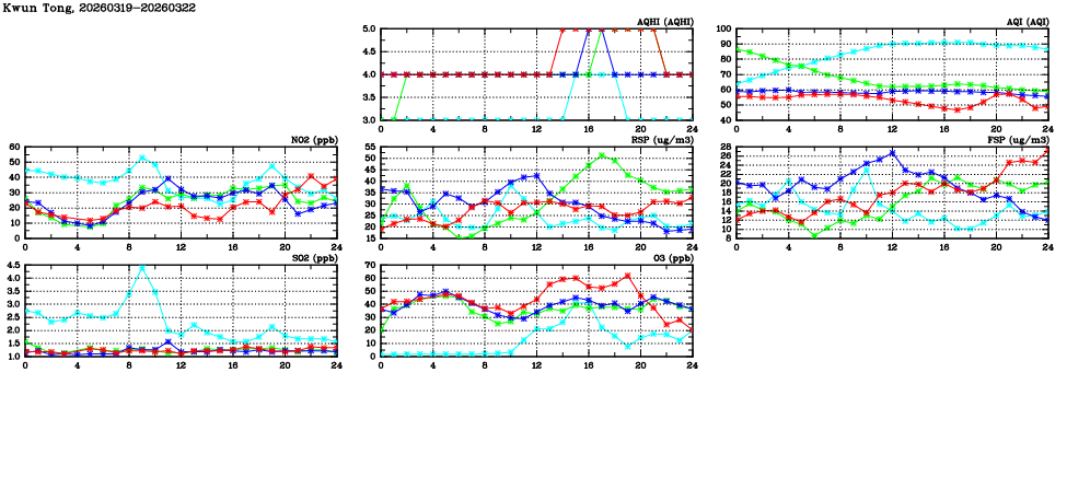 | Air Quality Data Time Series in Kwun Tong (2026/03/22) | ( Line colors: Day -3 Day -2 Day -1 Current day ) | 2D Map Current AQHI |