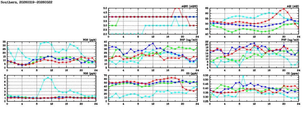 | Air Quality Data Time Series in Southern (2026/03/22) | ( Line colors: Day -3 Day -2 Day -1 Current day ) | 2D Map Current AQHI |