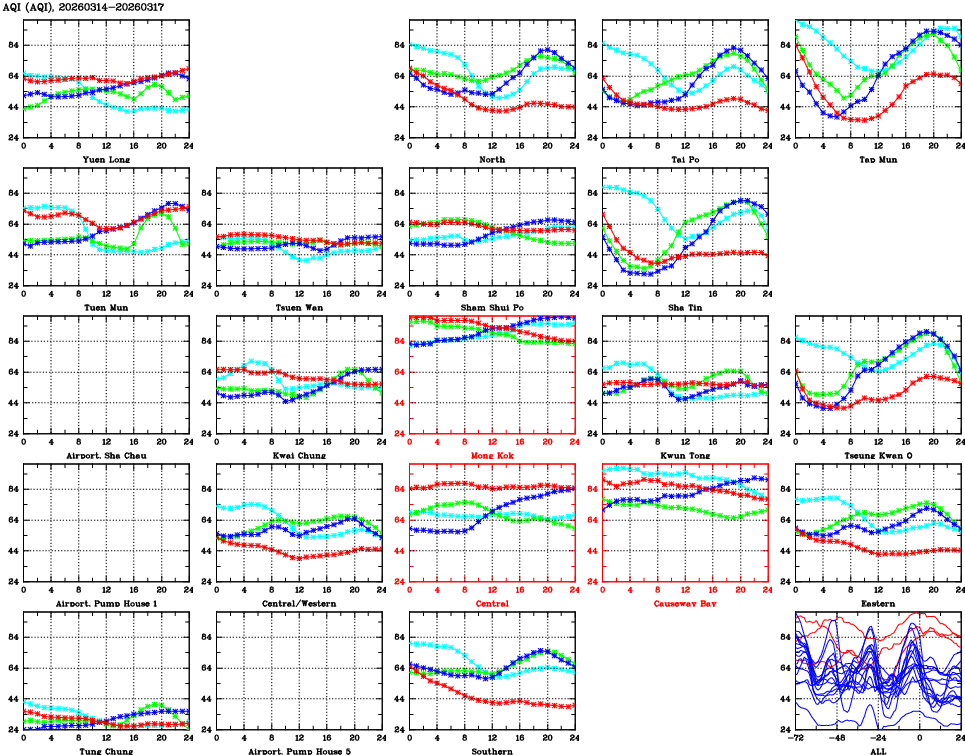 | Air Quality Data Time Series for AQI (2026/03/17) | ( Line colors: Day -3 Day -2 Day -1 Current day ) | 2D Map Current AQHI |