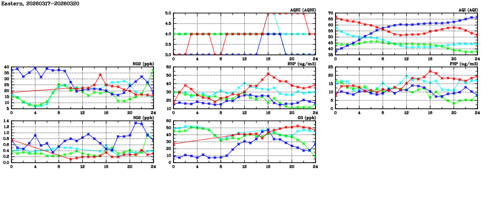 | Air Quality Data Time Series in Eastern (2026/03/20) | ( Line colors: Day -3 Day -2 Day -1 Current day ) | 2D Map Current AQHI |