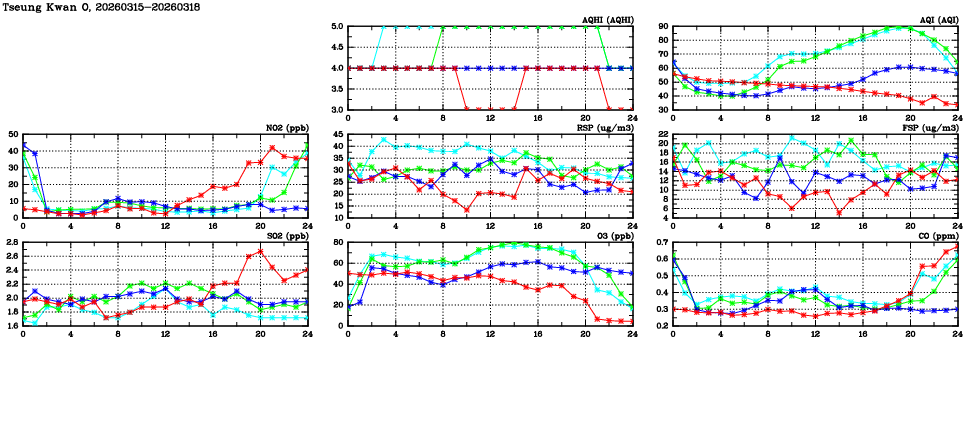 | Air Quality Data Time Series in Tseung Kwan O (2026/03/18) | ( Line colors: Day -3 Day -2 Day -1 Current day ) | 2D Map Current AQHI |